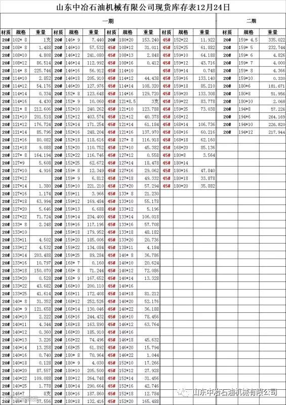 山东中冶2018年12月24日库存表 山东中冶石油机械有限公司