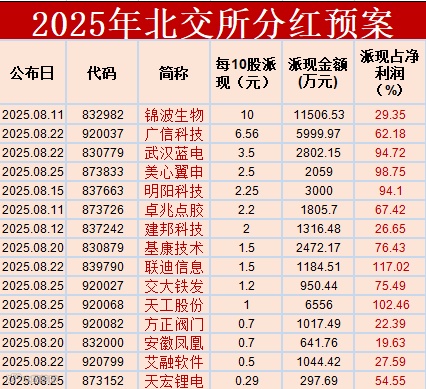北交所企业的分红持续性显著。以锦波生物为例,2024年年报派现1.77 亿元,2025年半年报再次派现1.15亿元,形成 “年报+中报” 双分红模式。联迪信息、天工股份等企业亦连续多年保持高派现率,体现出盈利质量的稳定性。