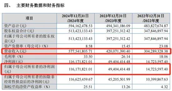 2022年至2024年,广信科技的营业收入分别为3.04亿元、4.20亿元、5.78亿元,归母净利润分别为1472.36万元、4940.44万元、1.16亿元。