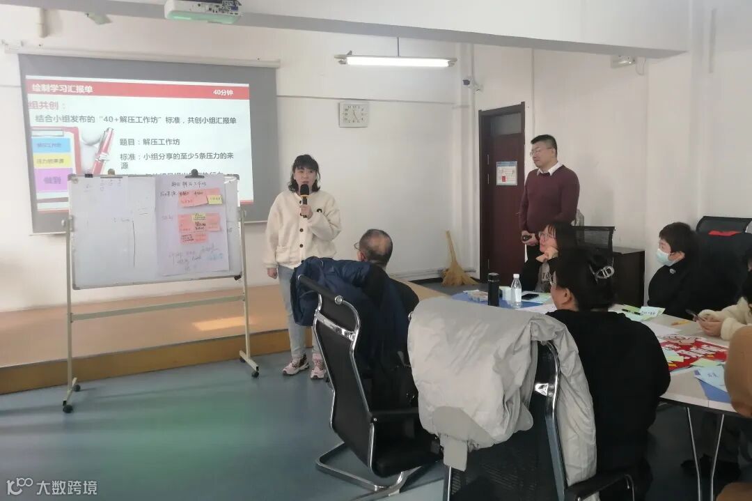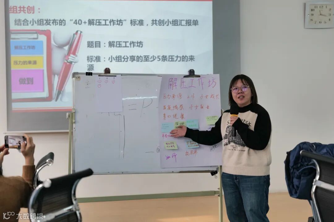 “生活中,我们压力来自于哪里?”讲师带领会员逐步探索压力的来源。小组内每名成员根据“SMSRT原则”针对自身压力源写出了两条应对压力的做法,三个小组分别在班级内进行了分享。通过分享,会员找到了释放压力的方法,明确了自身努力的方向,压力还可以转变成积极向上的动力。