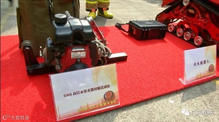 ▲现场展示的GKS高层水带及器材输送系统、灭火机器人