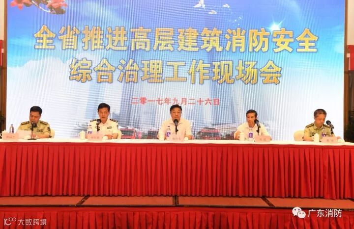 公安部消防局副局长魏捍东在会议上强调,广东要时刻保持清醒认识,提升做好高层建筑消防安全综合治理工作的责任感和紧迫感。当前,全国消防安全形势仍然十分严峻,高层建筑消防安全管理工作面临着“三难”问题(火灾防控难、人员逃生难、灭火救援难),引发群死群伤火灾事故的风险和压力非常大。广东作为我国改革开放的前沿阵地,高层建筑数量庞大,占比接近全国的九分之一,治理工作任务十分艰巨。他指出,现在距离党的十九大召开,还有不到二十多天的时间,做好这一时期的安保工作,意义和责任都十分重大。广东各地要广泛发动社会力量,调动一切可调动的社会资源,群策群力落实各项火灾防控工作任务。