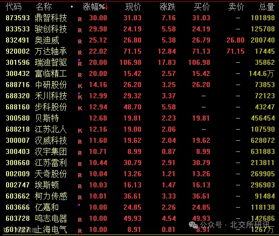 北交所全天震荡拉升,尾盘加速上扬,北证50指数大涨6.28%;报1216.755点。机器人板块集体爆发;稀土永磁板块跌幅居前,北交所个股多达240家上涨,仅15家下跌、1家平盘,总成交额为299.91亿元。