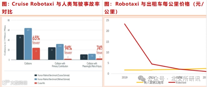 相较于传统模式,Robotaxi能够显著提高交通安全性。根据公安部数据,超过90%的交通事故是人为原因造成的。Robotaxi的实际运营表现在 特定场景下超越了人类,特别是在数据处理和精确度方面。根据北交所研讯统计,Robotaxi的碰撞率能降低65%,作为主要肇事方的碰撞率能降低94%,作为伤员的碰撞率降低74%。