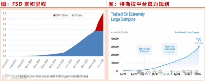 特斯拉拥有大量道路行驶数据,支撑着算法的更新迭代,截止2024年6月,FSD累计行驶里程达到16亿英里,其中FSD v12的行驶里程达到6亿英里。FSD的迭代以及Robotaxi所需的高阶自动驾驶技术都需要强大的算力来支持,截止2024年6月,特斯拉云端算力达到了35.5EFLOPS,领先于同行,并计划在2024年底前,将平台训练算力提升至100EFLOPS。8月公开了超算集群的名称Cortex,可以容纳10万张H100/H200,专门用来训练特斯拉的FSD和Optimus。