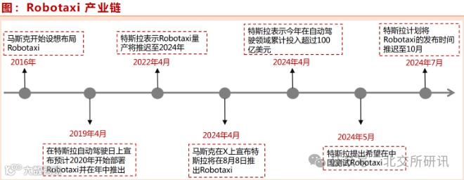 马斯克早在2016年就开始构想Robotaxi;2019年4月特斯拉宣布2020年开始部署Robotaxi;2024年4月马斯克表示将在8月8日推出Robotaxi,并表示今年在自动驾驶领域累计投入超过100亿美元。5月特斯拉提出希望在中国测试Robotaxi。7月特斯拉计划将Robotaxi的发布时间推迟至10月10日。