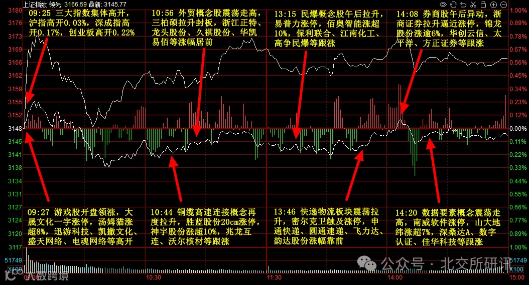今日三大指数小幅调整,微盘股指数涨近2%,黄白二线分化明显,题材概念轮动活跃。民爆概念股午后大涨,盛景微、易普力、保利联合、高争民爆涨停。游戏股大幅走强,汤姆猫、大晟文化、凯撒文化涨停,中青宝大涨14%。汽车整车股拉升,金龙汽车、中通客车、安凯客车涨停,长城汽车大涨8.33%。出口、高外销占比概念股表现活跃,爱丽家居、龙头股份、三柏硕等涨停;细胞免疫治疗概念下挫,济民医疗、南华生物跌停,泰林生物大跌12.95%;合成生物概念股走低,蔚蓝生物跌停。个股涨多跌少,沪深京三市超3400股飘红,今日成交8276亿元。