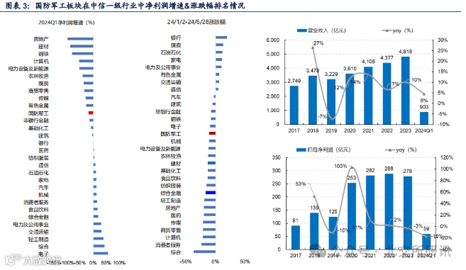 2024年上半年国防军工板块涨幅为-10.7%,位居中信一级行业排名第14。