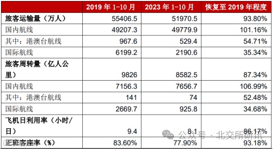 中国民航2023年1-10月部分生产指标恢复情况