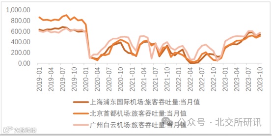 2023年 8、9、10 月上海浦东机场旅客吞吐量分别恢复到2019年同期的 87.16%、84.00%和 86.49%;北京首都机场旅客吞吐量分别恢复到2019年同期的 57.93%、59.37%和59.48%;广州白云机场旅客吞吐量分别恢复到2019年同期的 92.11%、87.40%和 90.94%。