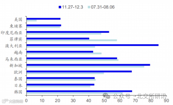 2023年10月国际旅客周转量共计139.5亿人公里,恢复至19年同期的53.72%。国际线恢复最薄弱的环节在中美航线,我们注意到美国交通部已于10月27日批准中美增班,自11月9日起允许中方航司每周执飞中美直飞航班35对(此前为24对)。11月15日,中美元首在美国旧金山会晤,同意明年早些时候进一步大幅增加航班。从最新一周的中国至主要国家出港航班量恢复情况来看,美国、澳大利亚、欧洲等优质航线恢复均较为领先。中国至主要国家出港航班量恢复进展