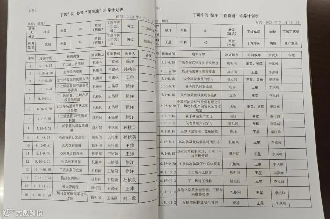 为深入贯彻落实公司2024年员工代表大会精神,积极落实公司人才强企工程部署,深化高技能人才队伍建设,近日,烯烃厂启动了“岗岗通”一人一策人才培养工作,持续提升员工技术、技能水平,努力实现由“全岗通”向“岗岗通”升级转变的奋斗目标。