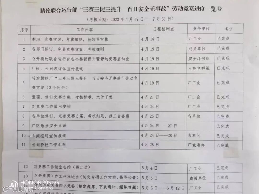 二是责任落实到位。4月19日召开劳动竞赛启动会。以推进会形式对公司、厂竞赛部署进行再宣传、再发动。制订七大类165项考核内容,实行日汇总、周讲评、月考核,确保竞赛目标严细实。