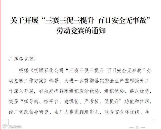 一是机制保障到位。制定下发《关于开展“三赛三促三提升 百日安全无事故”劳动竞赛的通知》,召开了“腈纶联合运行部安全整顿提升暨劳动竞赛启动会。组成了以厂党政领导任组长的竞赛组委会,健全组织保障。