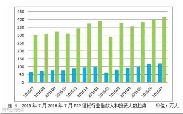 2016年7月,我国P2P行业活跃借款人估计在121.2万左右,同比增加80.9%,环比小幅增加4.8%,单个借款人平均借款金额约13.0万元,与上月(13.2万元)基本持平;投资人数则在416万人左右,环比增长3.4%。
