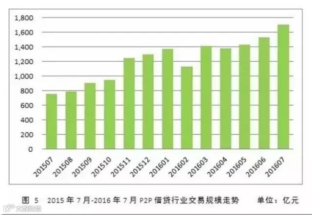 2016年7月,全国P2P借贷行业整体交易额约为1,707亿,同比增长125.8%,环比增长11.4%,创近四月以来的最高增速。其中,