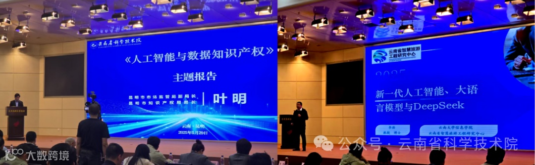 昆明市市场监管局副局长、昆明市知识产权局局长叶明以“人工智能与数据知识产权”为题作主题报告,详细讲解了昆明市数据知识产权发展现状、问题与挑战,人工智能赋能数据知识产权的具体应用场景、未来发展趋势以及长远意义。云南大学信息学院李浩教授以“新一代人工智能、大语言模型与DeepSeek”为题作主旨分享,详细讲述了大语言模型发展历史以及DeepSeek的主要特点,探讨了AI +数字技术赋能云南高原特色农业的推广模式,以及多元合作模式与高原特色农业产业生态构建路径。
