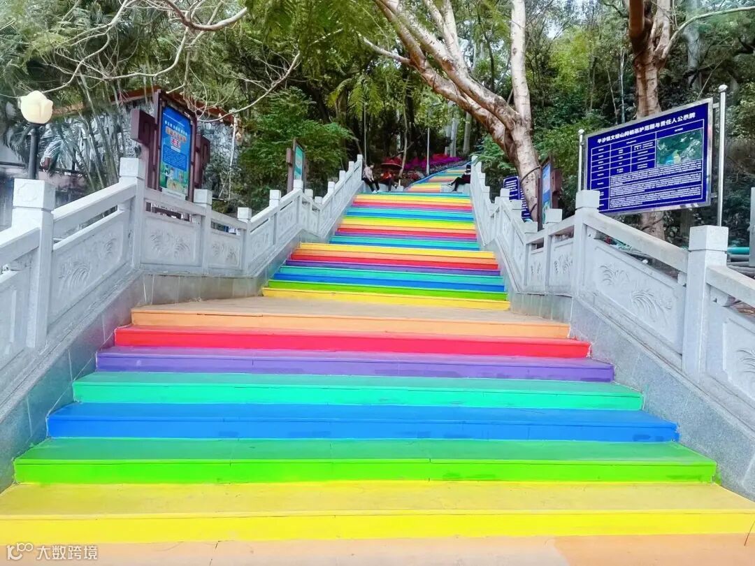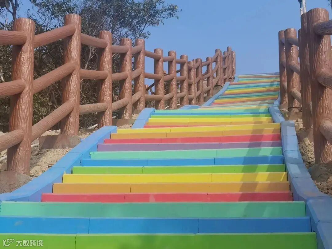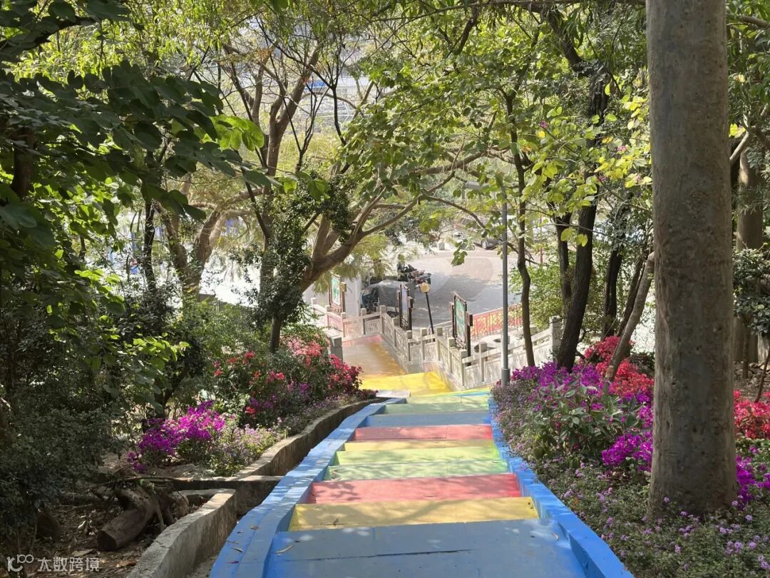沿西侧步道拾级而上,两侧水泥仿生木扶手与周边自然生态融为一体,1.7米的阶宽对游人的膝盖更为友好,东西两侧步道的彩虹台阶宛如嵌入蓝天绿野的五彩祥云,引人入胜。