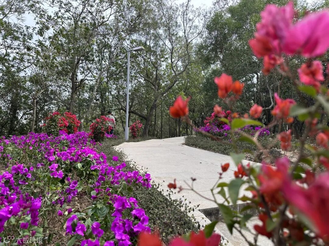 沿线共设12处景观节点,种植紫花勒杜鹃、马樱丹、虎刺梅等花树,并辅以造型植株进行点缀,形成错落有致、色彩斑斓的植物景观带,所种绿植均为多年生作物,能做到常年开花。