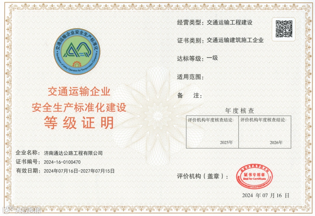 近期,交通运输部安全生产标准化评审专家,按照《交通运输建筑施工企业安全生产标准化评价实施细则》,对公司安全生产标准化工作进行了全面深入的考评,公司以扎实、有效的工作成绩,顺利通过安全生产标准化一级达标认证。