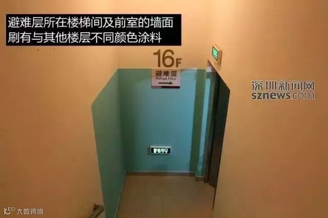 避难层的门开向于其他楼层不同:其他楼层门都开向楼梯,而避难层、底层以及顶层的楼梯门朝向房间,便于逃生者迅速从其他楼层进入楼梯,逃向避难层、出口等。避难层之所以设计在15层左右,就是考虑到发生火灾时,无论在哪一层,向上逃生或向下逃生的最大楼层不超过7层。多于7层,一般人的体能就会受到影响,逃生效果就会大打折扣。