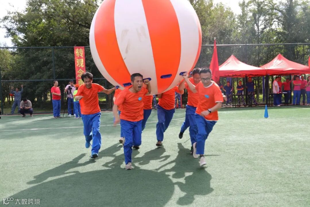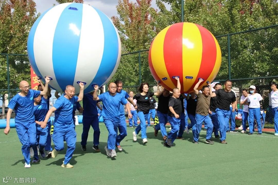 8人举起气球过肩立于起跑线后,向前奔跑,绕过障碍桩到达胜利的彼岸。