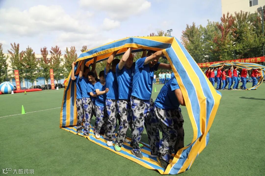 8名队员进入条幅道具,他们各自分工,全力以赴通过50米跑道。