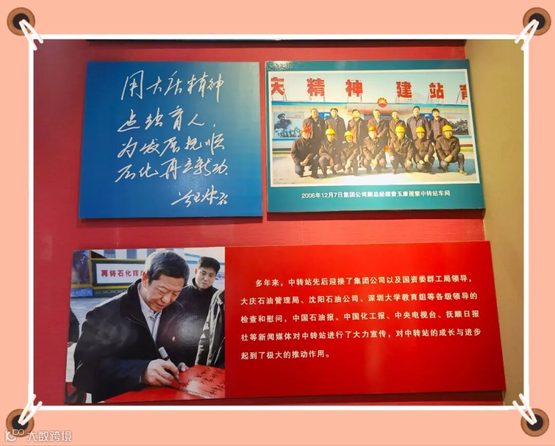 “小站熔铸大庆魂哪!今年是铁人王进喜同志诞辰100周年,我觉得这块展板有着特殊的重要意义。”双人雕塑主持人带着大家来到一块展板面前:“这块展板是在2006年12月,时任集团公司副总经理曾玉康同志视察中转站车间时,挥笔留言:用大庆精神建站育人,为发展抚顺石化再立新功。这句话,给了我们莫大的鼓励!”