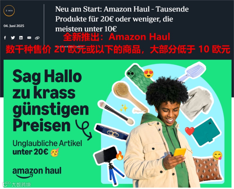 近日,亚马逊在德国站推出了低价商城Amazon Haul测试版,德国用户可在亚马逊购物应用中,找到低价商城专区,购买包括日常用品、时尚配饰、家居用品等在内的数千种低价商品。