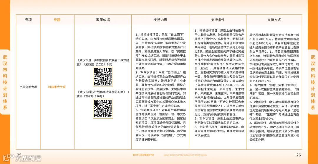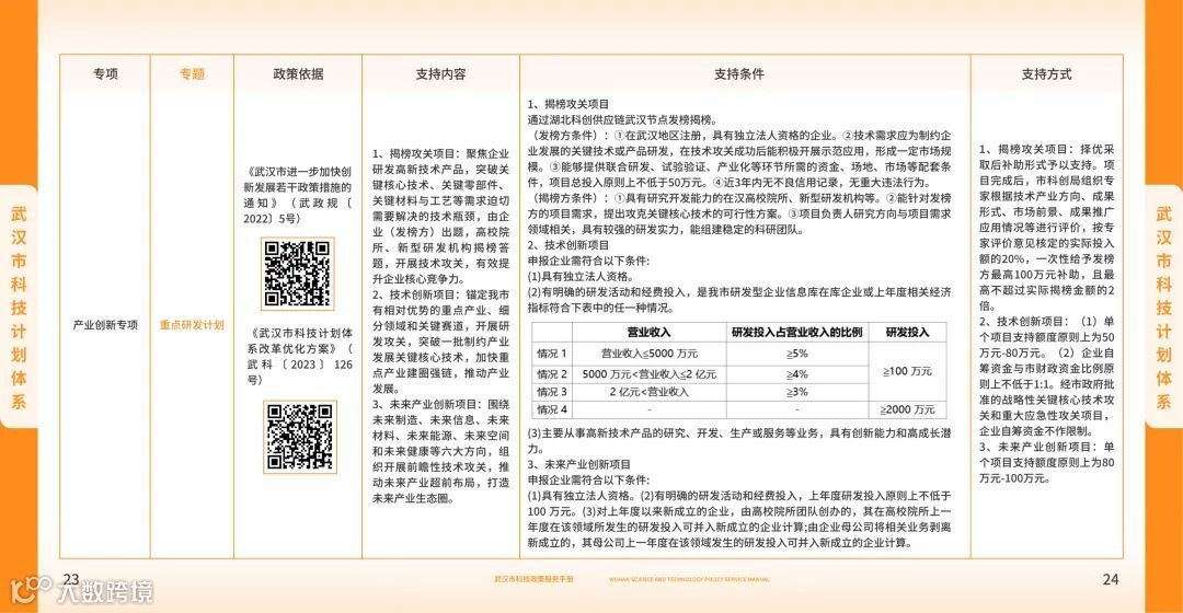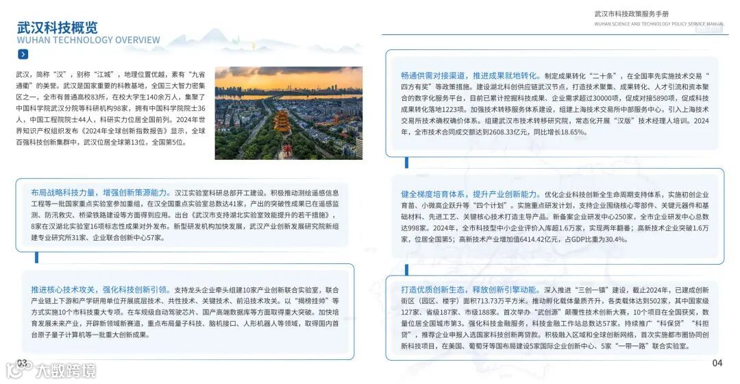 手册(2025)》(以下简称“科技政策服务手册”)。《科技政策服务手册》内容分为武汉科技概览、科技政策简介、武汉市科技计划体系三大版块