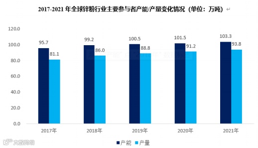 2017-2021年,全球锌粉行业市场规模呈现逐年增长的态势,锌粉产能及产量稳定增 长。2019年,全球贸易摩擦不断,经济呈现下行趋势;2020年,新冠疫情爆发,对全球工 业产生了巨大的冲击。但受益于下游涂料行业广泛的应用领域,全球锌粉主要产能及产量 仍呈现稳步增长状态,2021年,全球锌粉行业主要参与者的产能达到103.3万吨,产量实 现93.8万吨。