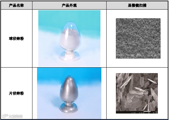 锌粉按粒子结构通常可分为球状、不规则颗粒状和片状三种。球状锌粉采用蒸馏法生产工艺生产,不规则颗粒状锌粉一般采用雾化法生产,片状锌粉则是采用球状锌粉或不规则颗粒状锌粉为原料研磨而成。主要产品介绍如下: