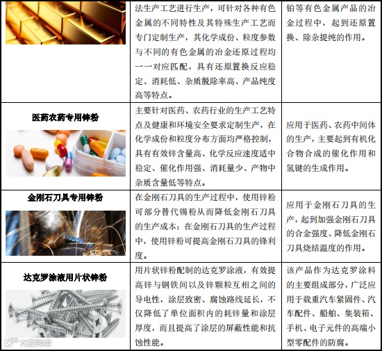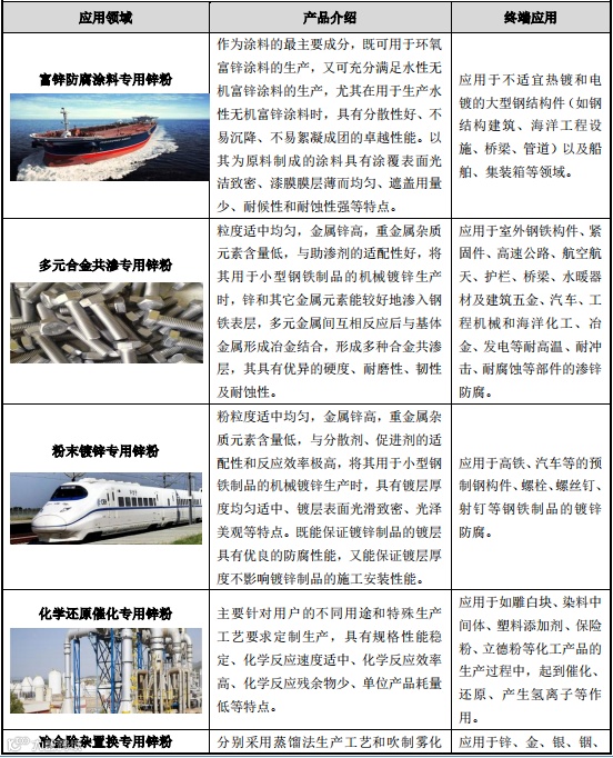 公司产品广泛应用于富锌防腐涂料、渗锌、粉末镀锌、化工、有色冶金、医药等领域, 并与中集集团、中化集团、中国重工、中远海运等央企或其子公司, 以及宣伟涂料、金刚化工、中涂化工、阿克苏诺贝尔、关西涂料等世界前二十大油漆和涂 料生产企业建立了稳定的合作关系。
