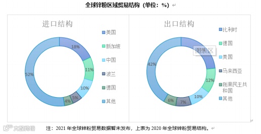 全球锌粉贸易活跃,2020年,全球锌粉贸易金额达到4.94亿美元。其中,2020年,锌 粉的最大出口国是比利时(1.15亿美元)、德国(5,830万美元)、美国(4,870万美元)、 马来西亚(3,620万美元)和刚果民主共和国(2,950万美元)。2020年,锌粉的最大进口 国是美国(8,940万美元)、新加坡(5,510万美元)、中国(4,710万美元)、波兰(2,330 万美元)和德国(2,030万美元)。