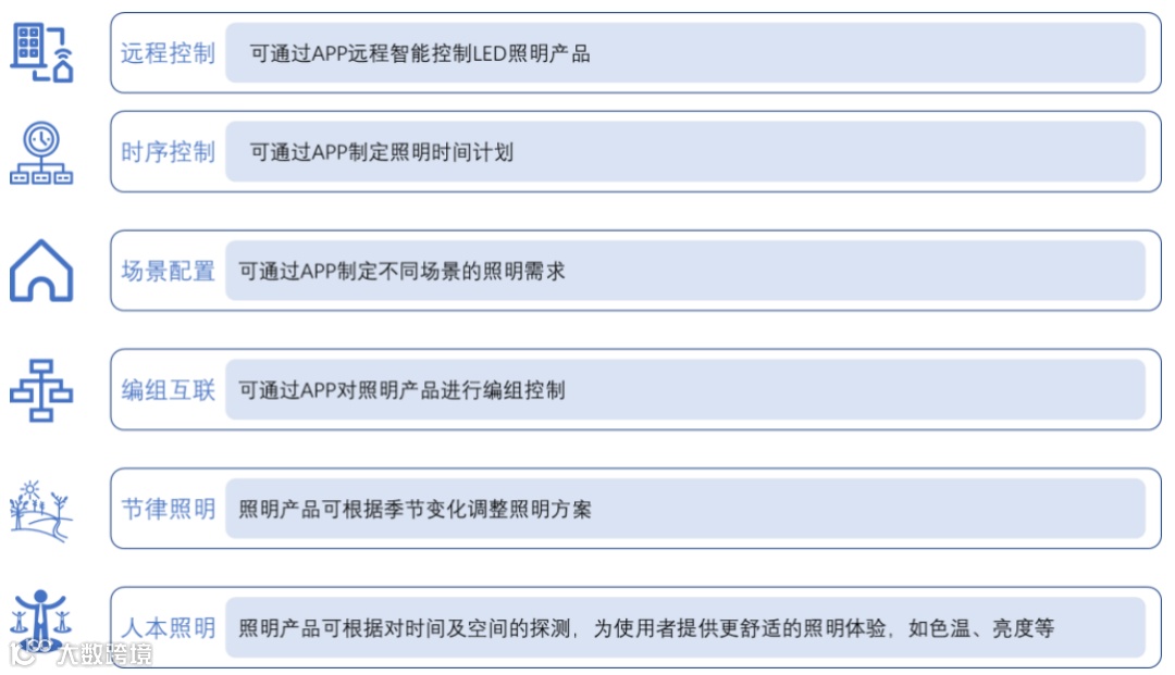 目前公司产品可通过采用 Zigbee、Wi-Fi、蓝牙、DALI 等主流的物联网通讯技术,使得智能照明产品在 LED 照明产品基础上通过集成通信模块,实现远程控制、时序控制、场景配置、编组互联、节律照明、人本照明等多场景的智能控制方案。