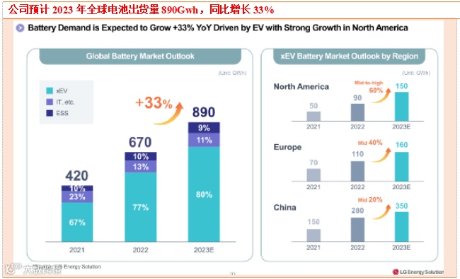公司预计2023年全球电池出货量890Gwh,同比增长33%,其中动力电池出货量占比80%,同比增长38%;其中美国出货量150Gwh,同比增长60%,欧洲出货160Gwh,同比增长40%,中国出货350Gwh,同比增长20%。