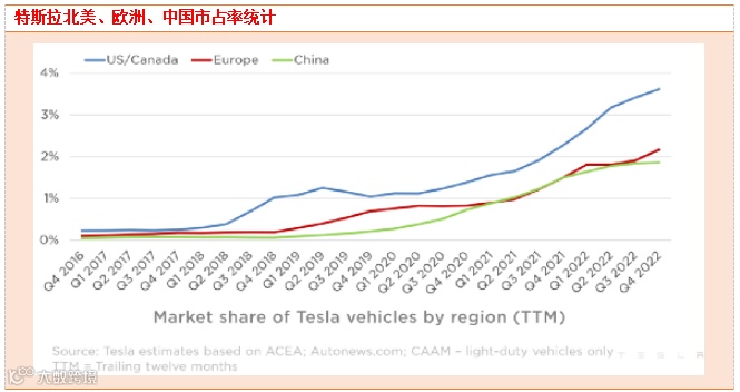根据行业数据,特斯拉在美国/加拿大的市场份额(合计)在3.5%以上,并且正在接近4%。在欧洲,特斯拉的市场份额历史上首次超过2%,后续特斯拉ModelY的本地产量将会增加,价格会降低,并且该车型有资格在德国(欧洲最大的电动汽车市场)获得激励,份额将逐步提升。在中国,特斯拉份额最近几个季度相对稳定,不到2%。