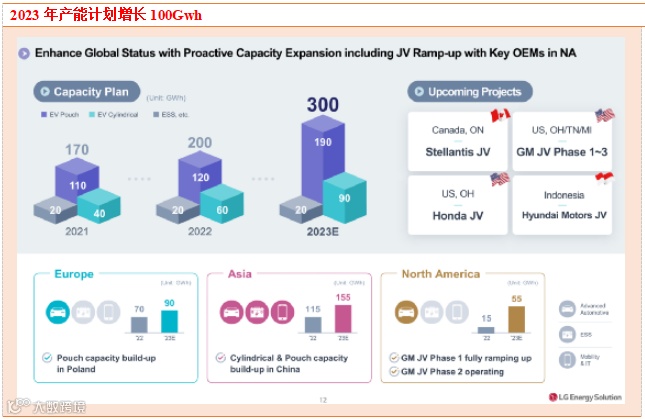 公司规划2023年产能300Gwh,同比增长100Gwh;其中软包电池190Gwh,增加70Gwh;圆柱电池90Gwh,增加30Gwh;储能电池20Gwh,零增速;LGES表示,预计未来其全球电池产能的近一半将分配给北美地区,并补充说,预计到2025年底,年电池产能将达到约540吉瓦时(GWh)。