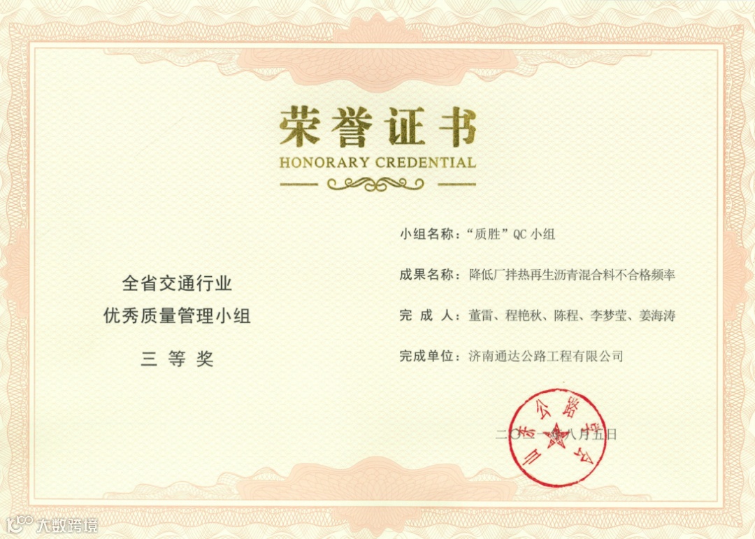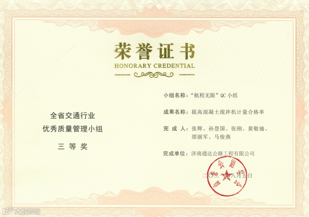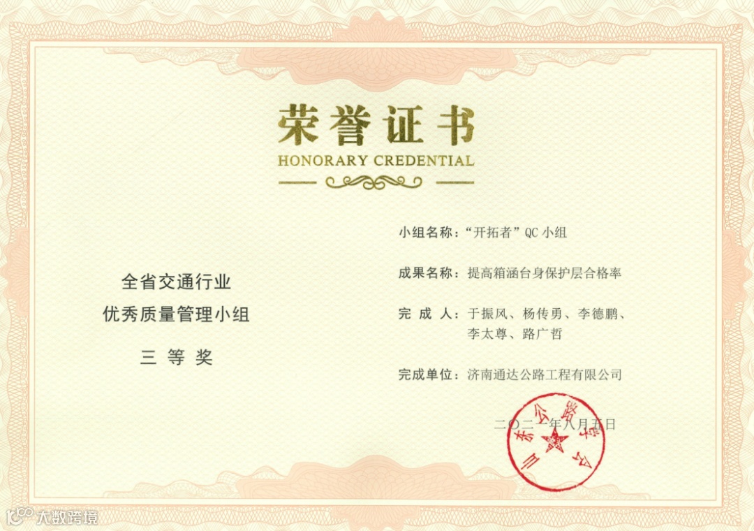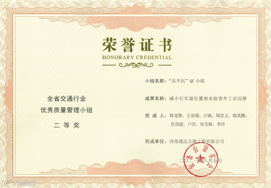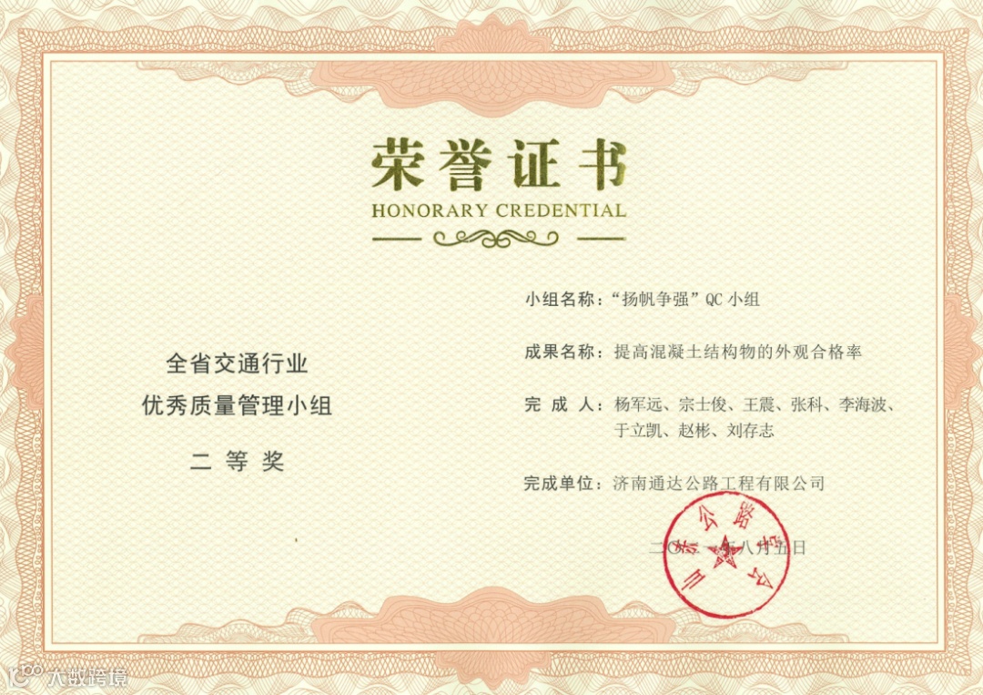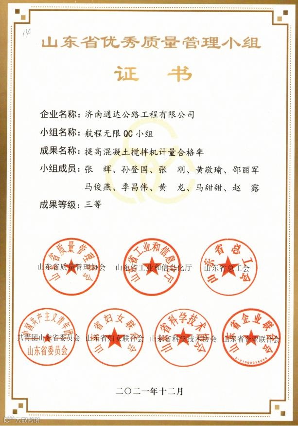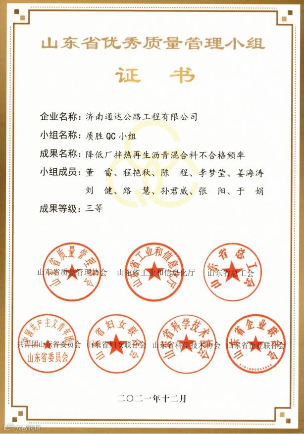 其中,荣获全省交通行业优秀质量管理小组二等奖2项,三等奖5项;荣获山东省优秀质量管理小组三等奖2项,突破公司历年获奖成果新高,QC活动质量持续提升。