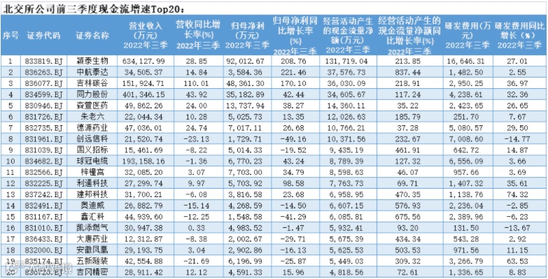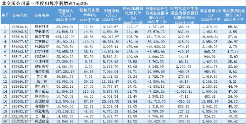根据三季报归母净利增速排名,有7家公司实现利润翻倍增长,其中骏创科技、中航泰达以及颖泰生物均以两倍的增长速度名列前茅。此次斩获北交所业绩“增速王”的是骏创科技,实现归母净利4463.57万元,同比增长222.17%。公司称,三季度业绩爆发式增长主要系下游新能源汽车销量同比大幅增长,加之公司积极拓展市场,汽车金属零部件的客户数量逐步增长带动公司业绩增长。