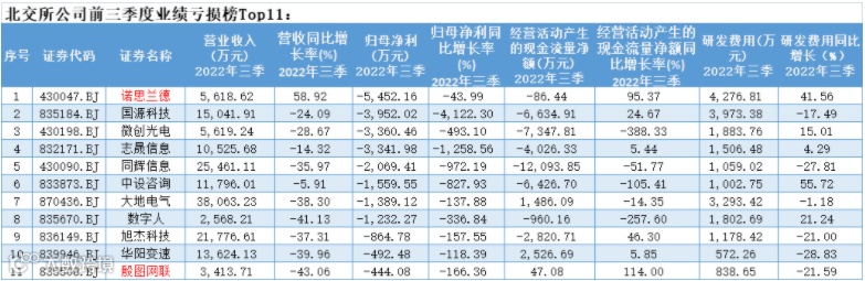 根据三季报显示,有11家企业今年前三季度处于亏损状态,8家亏损在1000万以上,3家亏损在400万-900万之间。其中诺思兰德和殷图网联2家企业连年亏损,其余国源科技、微创光电以及志晟信息等9家公司由盈转亏。
