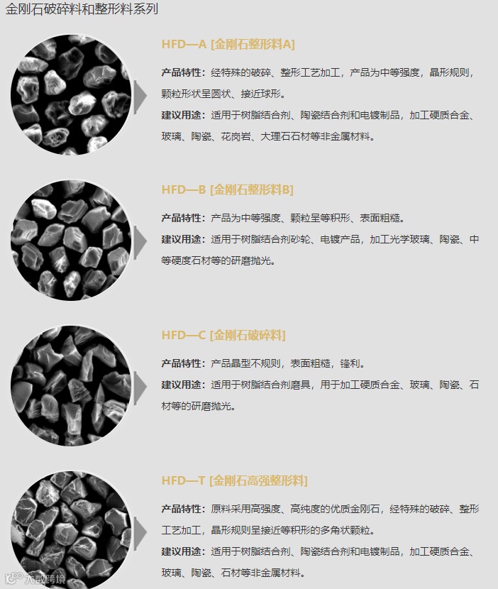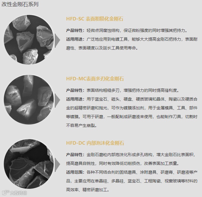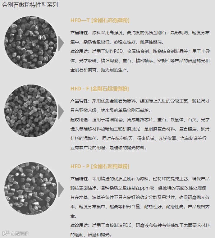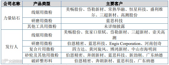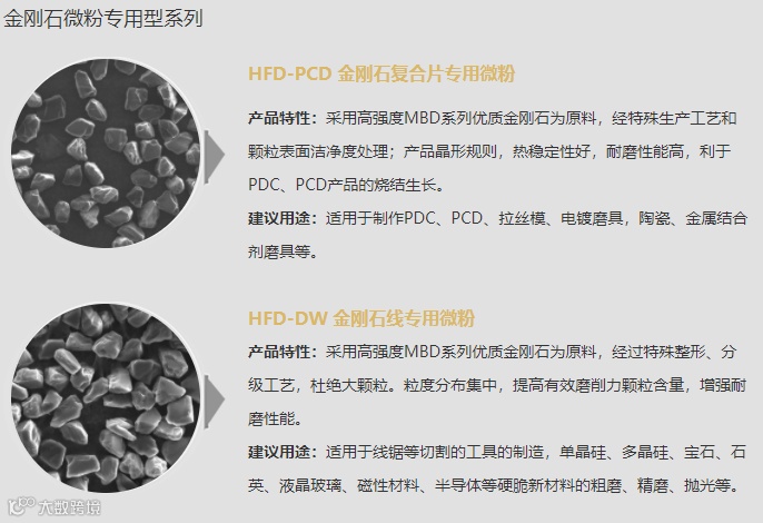 金刚石微粉具有超硬、耐磨、导热、生物兼容性强等优良性能,产品主要 用于制作金刚石线锯、研磨抛光液等超硬钻探工具、超硬切削刀具、超硬固结 磨具及其他制品,终端广泛应用于清洁能源、消费电子、半导体、陶瓷石材、 油气开采、机械加工等行业。公司凭借产品质量优势和技术优势,坚持自主创 新,不断拓展产品应用领域,下游客户包括不同领域的上市公司以及龙头企 业,公司产品还出口至美国、日本、韩国、欧洲等地区。