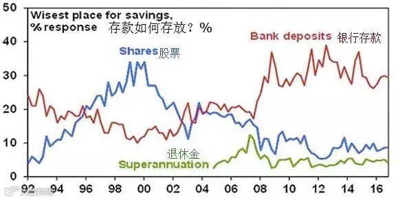 奥利弗博士指出,现下,短期投资者过于乐观,但从长线仓位形势判断,市场依然谨慎。以美国为例,大量投资者过去几年内蜂拥买入较为安全的债券基金,尚没有转身投向股市。在澳洲,拿个人储蓄来炒股的比例仍相对较低,人们还是喜欢把钱存进银行吃利息。下图可说明: