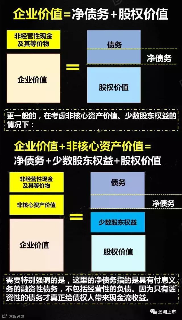 估值的对象当然是企业的真实价值,从现金流产生的角度讲,企业价值是企业拥有的核心资产运营所产生的价值;从现金流去向的角度讲,企业价值是指企业所有出资人(包括债权人、股东)共同拥有的企业运营所产生的价值,既包括股权的价值,也包括债权的价值。在日常的交易中,我们通常以股权价值为落脚点,经常直接评估股权价值或者用企业价值减去净债务价值来得到股权价值。