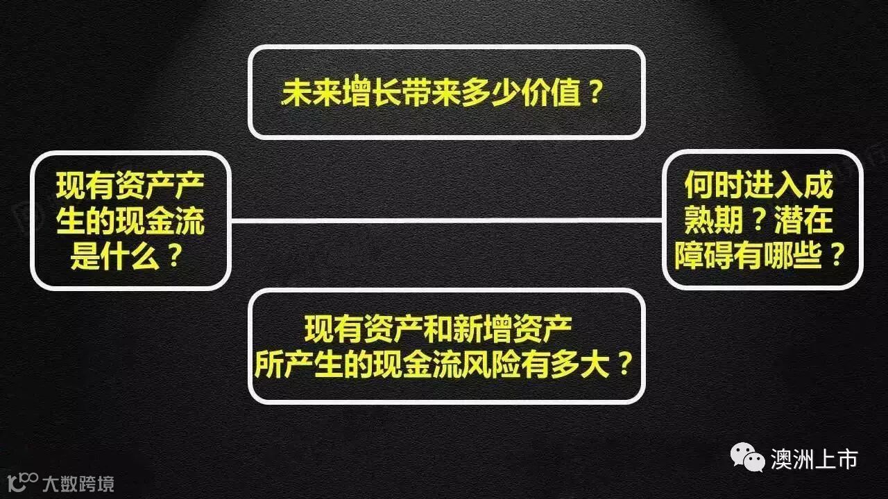 通常关注的问题包括:近期企业现有资产会产生多少利润及现金流;预期这些利润及现金流的增长率是多少;现有资产所产生的现金流能持续多长时间。