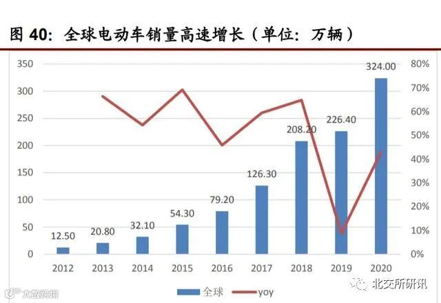 全球纵观 根据 EV VOLUMES 公开披露数据显示,全球电动车销量由 2012 年的 12.50 万 辆增至 2020 年的 324 万辆,年复合增速 50.21%,增长势头强劲,对应渗透率 由 0.15%升 4.16%。分地区和国家来看,中国在政策支持下从 2014 年开始进入电动车销量爆发期, 销量由2014年的7.48万辆增至2020年的136.73万辆,年复合增速高达62.32%,对应全球销量比重由 23.29%提升至 42.20%,成全球最大电动车市场,渗透率由 0.32%提升至 5.40%,最新今年前十月提升至 12.12%。