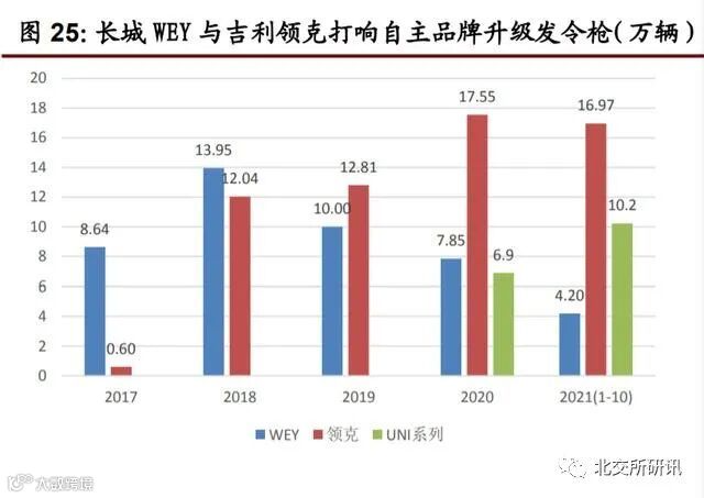 自主作为追赶者,为了避开合资锋芒,寻求差异化竞争以站稳市场,长期以来以 10 万元以下与 10-15 万元价格区间的车型为主,低端代步实用的品牌形象深入人 心。经过多年积累与储备,长城与吉利率先实施品牌升级行动,分别推出 WEY 与领克两大子品牌,向 15-30 万元价格区间进军,领克表现较为优秀,销量由 2017 年的 0.6 万辆持续增长至 2020 的 17.55 万辆,年复合增速高达 207.88%;长城 WEY 虽然整体销量表现不佳,但今年以来在柠檬平台与咖啡智能的助力下,陆 续推出新车型摩卡、拿铁及玛奇朵,进一步提升品牌车型竞争力,未来销量仍值 得期待。