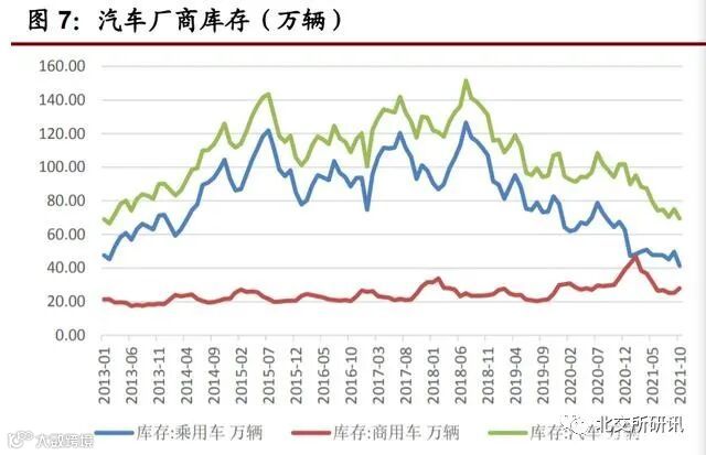 2、经销商库存(渠道库存):10 月汽车经销商库存深度系数 1.29,相比上月略有回升,连续第五个月低于 1.5 的警戒线,仍位于历史同期低位。整体来看,10 月主机厂在向渠道压库,导致渠 道库存有所回升。尽管芯片供应虽有边际改善,但供应仍偏紧,无法完全有效满 足终端需求,导致整体库存仍处于低位,未来随着芯片供应回升,补库将逐步推 进。