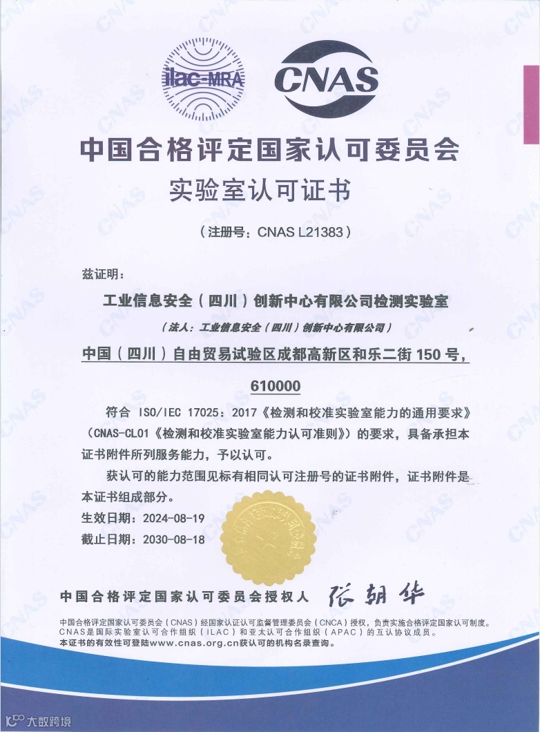 近日,四川省工业信息安全创新中心检测实验室(以下简称实验室)顺利通过了中国合格评定国家认可委员会资质评审及合格评定,成功获得国家认可实验室 CNAS 资质证书(注册号:CNAS L21383),标志着实验室已经建立了符合国际标准的质量管理体系、软硬件设备设施、管理水平和检测技术能力。