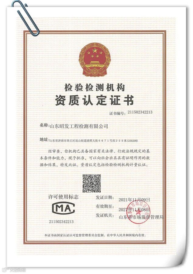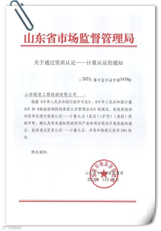 11月10日,山东昭发工程检测有限公司顺利通过了资质认定评审,收到来自山东省市场监督管理局下发的CMA计量资质认定证书,标志着我公司可以面向社会出具具有法律效力的检测检验数据及报告。